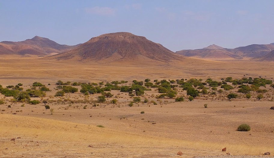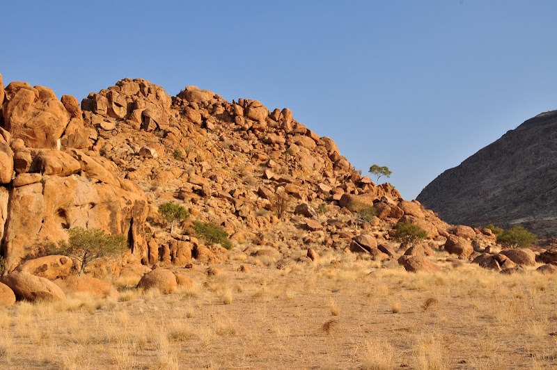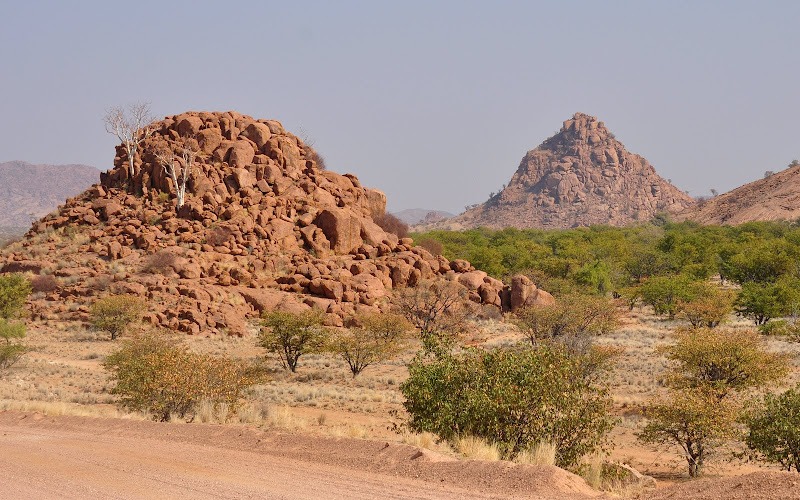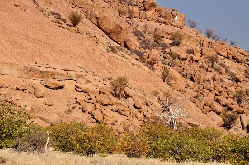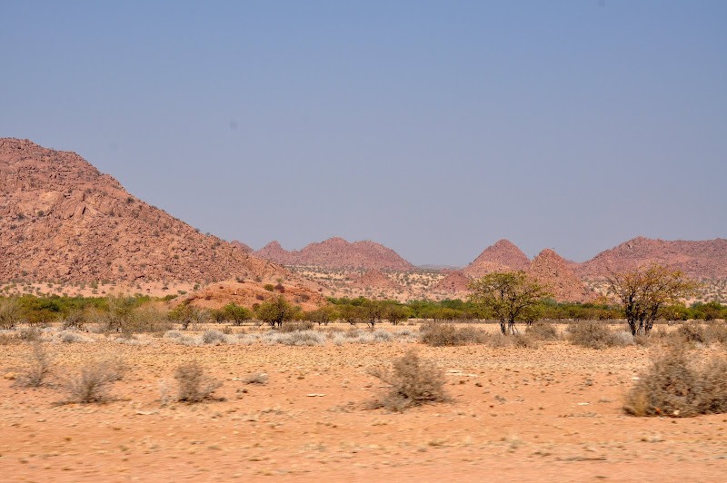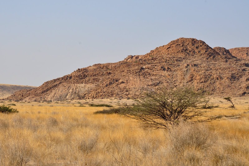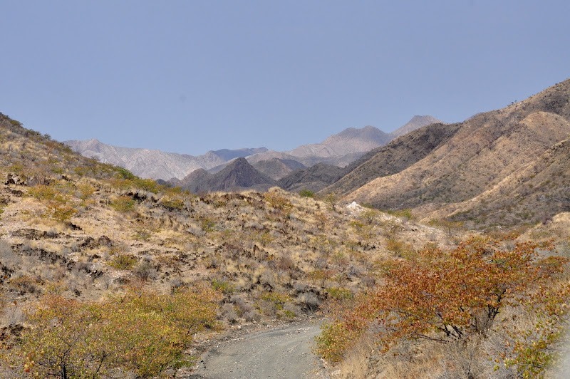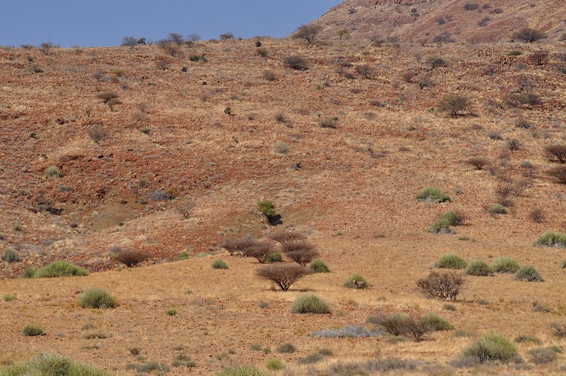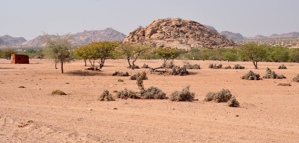 Ensuite nous continuerons vers le Nord Est, mais là plus de belle piste, c’est plus aventureux, tellement que notre Gps nous égarera un peu. Par cette piste nous rentrons dans le sud du Damaraland, magnifiques paysages de savane avec quelques arbres verts et des rochers rouges, avec au fond le Brandberg qui trône du haut de ses 2.000 mètres. Nous le contournerons par le sud pour loger à l’Est dans le Brandberg White Lady Lodge.