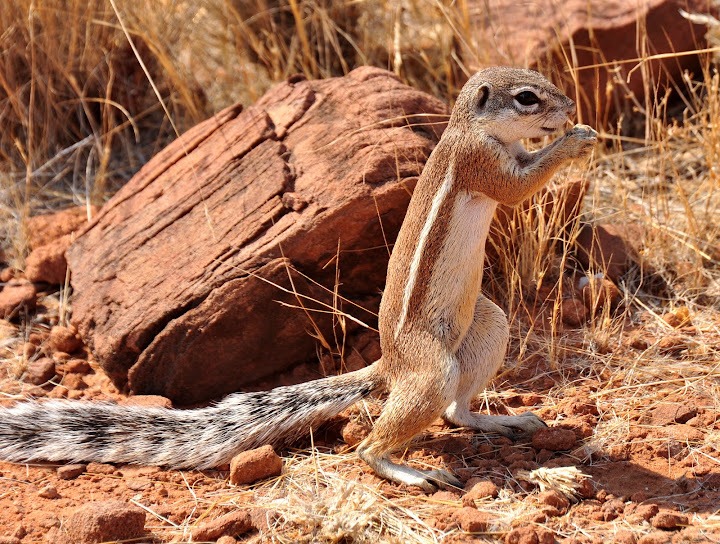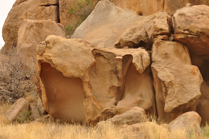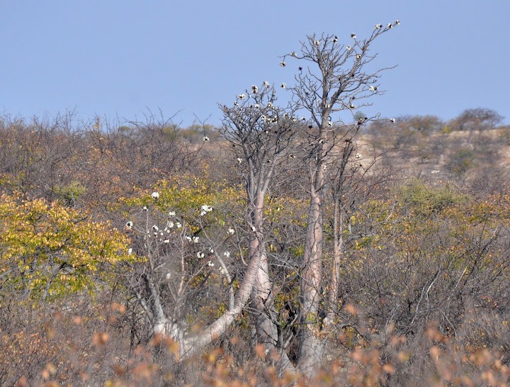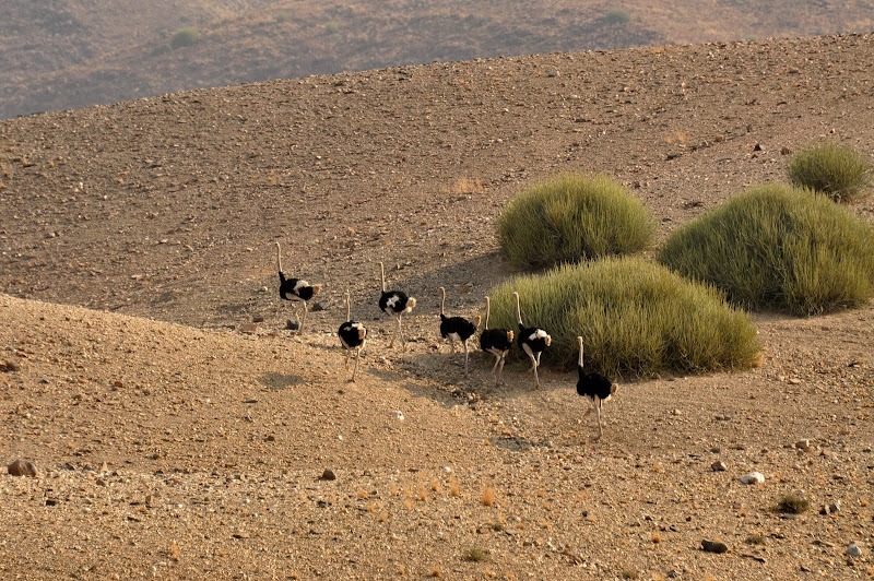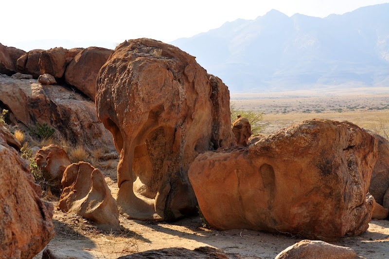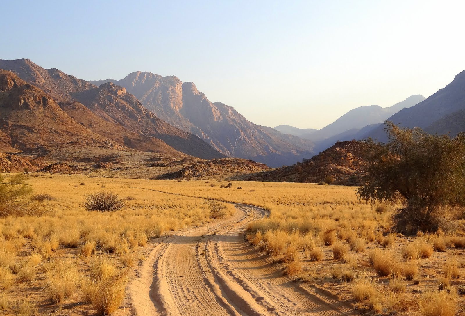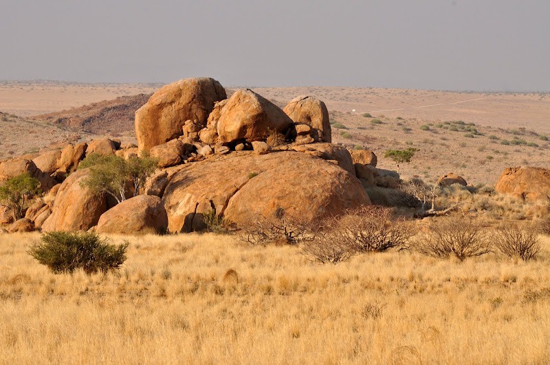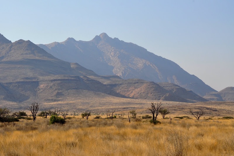 Ensuite nous continuerons vers le Nord Est, mais là plus de belle piste, c’est plus aventureux, tellement que notre Gps nous égarera un peu. Par cette piste nous rentrons dans le sud du Damaraland, magnifiques paysages de savane avec quelques arbres verts et des rochers rouges, avec au fond le Brandberg qui trône du haut de ses 2.000 mètres. Nous le contournerons par le sud pour loger à l’Est dans le Brandberg White Lady Lodge.