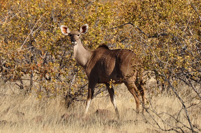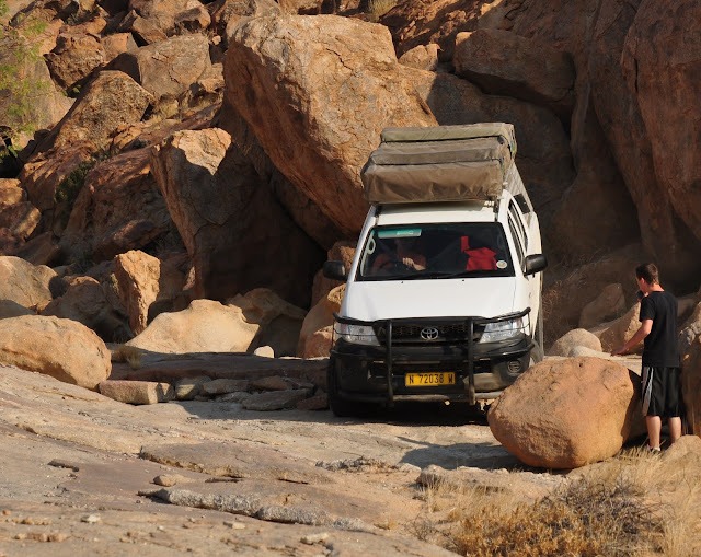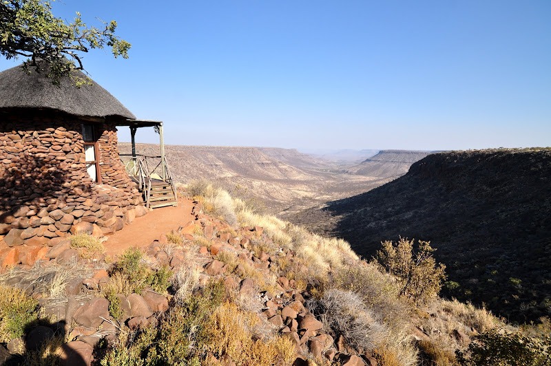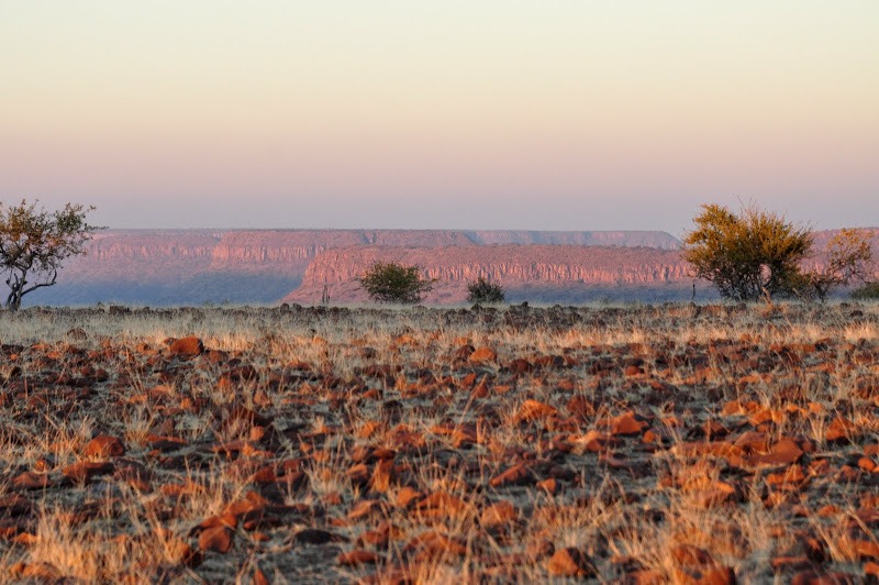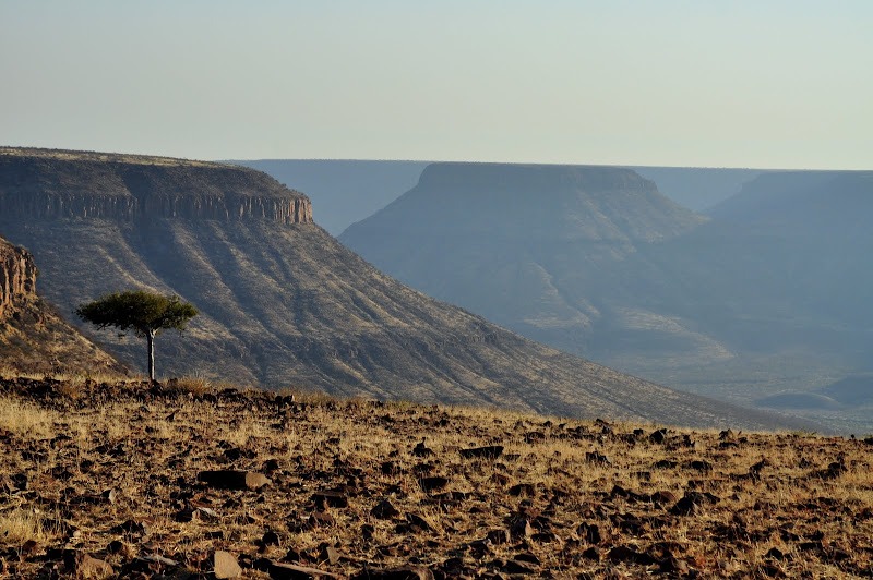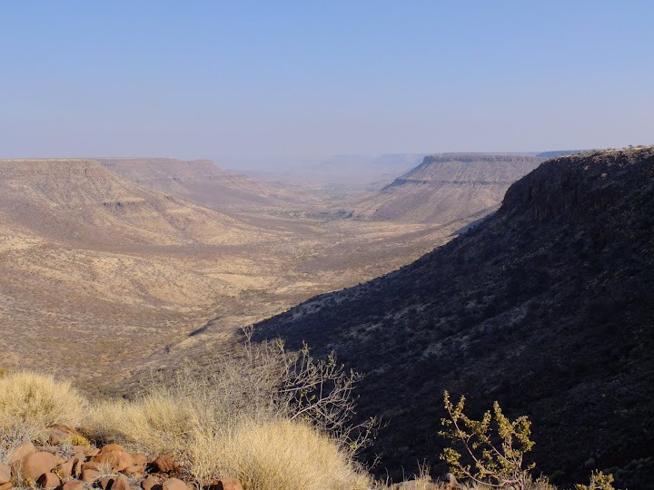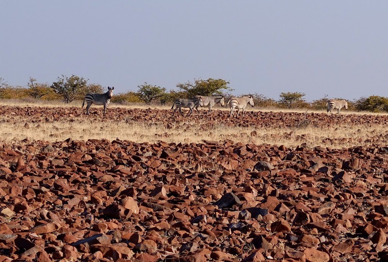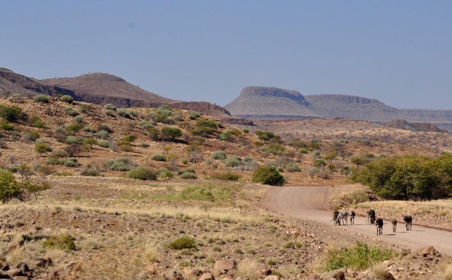 Après un déjeuner « tiré du sac » nous continuerons vers le Grootberg Lodge, un des plus beaux de Namibie, au sommet d’un plateau avec une vue époustouflante sur la vallée. Un arrêt à Palmwag, la seule station service avant plusieurs jours. C’est à cet endroit qu’on passe la barrière sanitaire qui empêche la circulation des animaux et de la viande cru dans le sens nord-sud)..