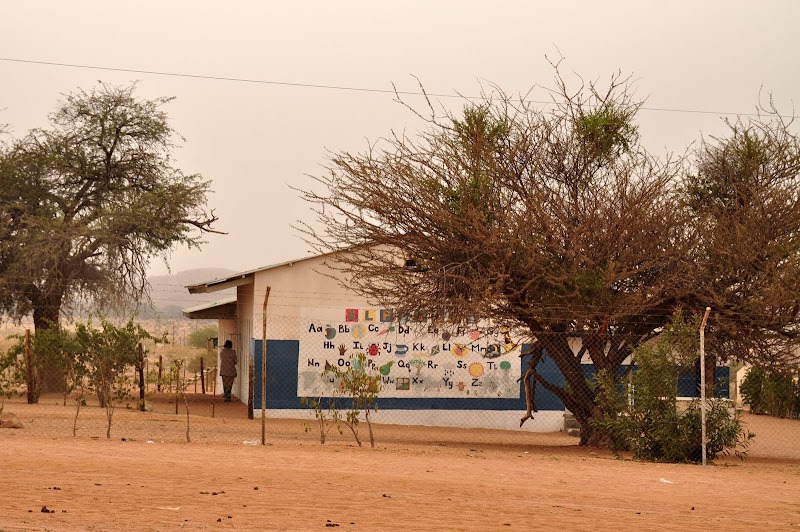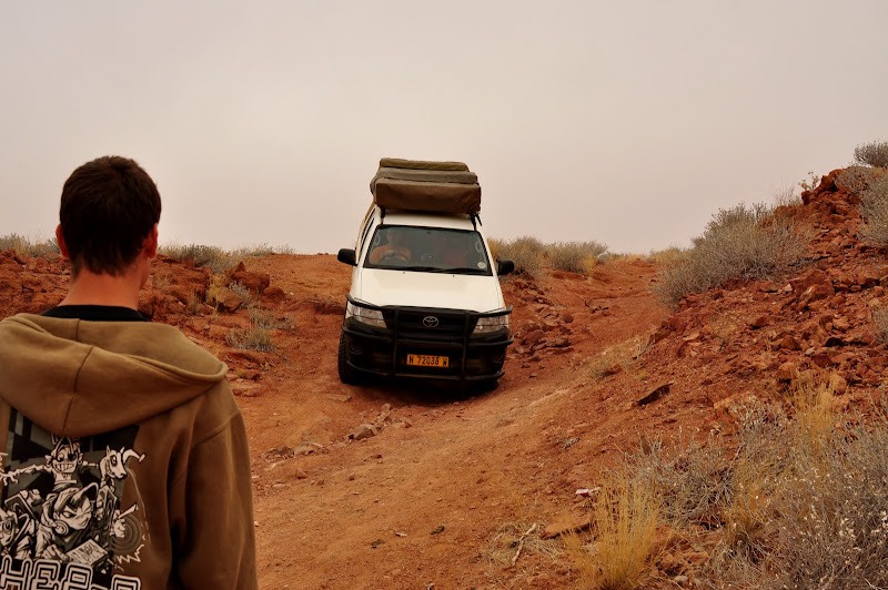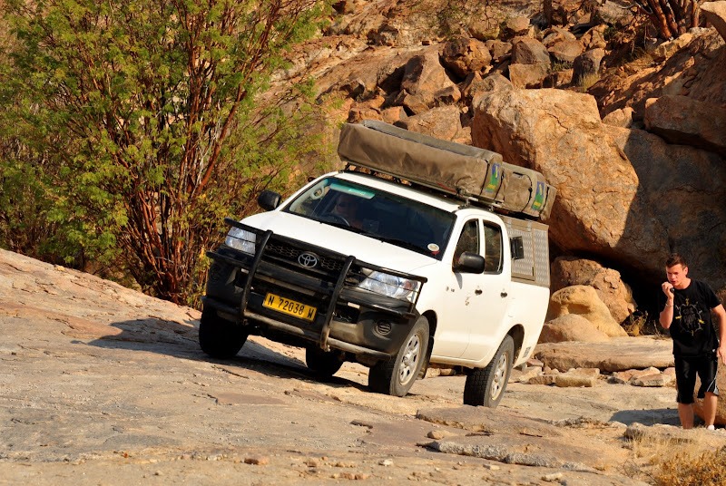 Suivra un bon petit déjeuner au cours duquel je discuterais avec des Français qui reviennent d’Etosha, ils m’ont fait part des difficultés pour trouver de la nourriture, il faudra qu’on renforce les stocks. Pour nous cela fait deux jours qu’on a rien croisé et on ne pourra faire des achats que dans deux jours à Opuwo. Aujourd’hui longue route pour atteindre le coin le plus « perdu » de notre périple, PURROS, au milieu du Kaokoland. D’abord une descente aussi raide qu’était la montée. Ensuite « grande piste » avec un arrêt dans une épicerie locale « Mic Mic » (petit et protégée par des barreaux) pour racheter de l’eau et du pain dans une « boulangerie » (petite case en fait) à côté.