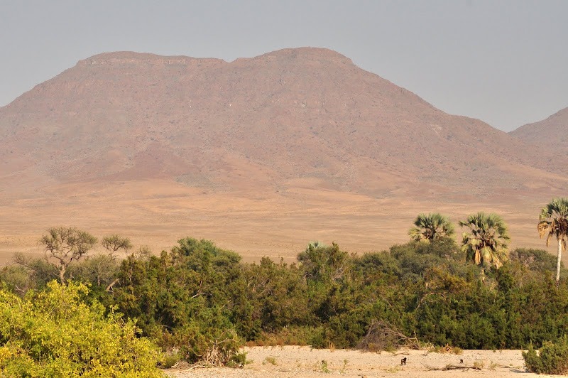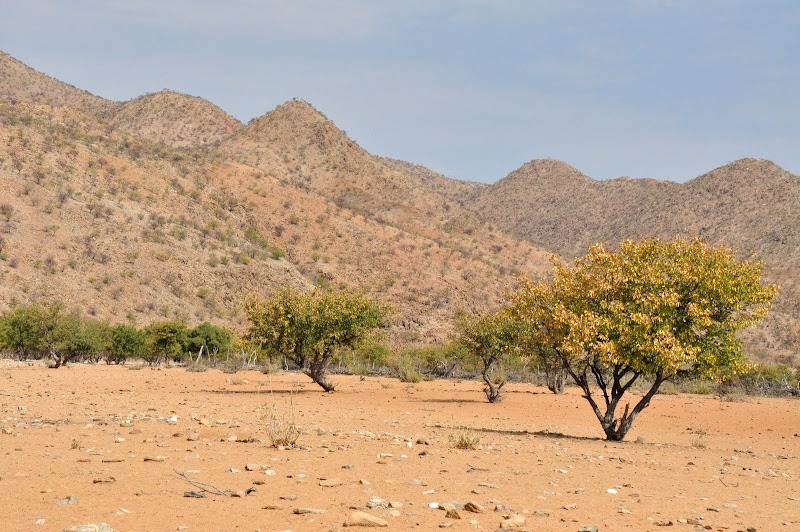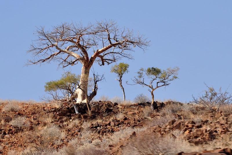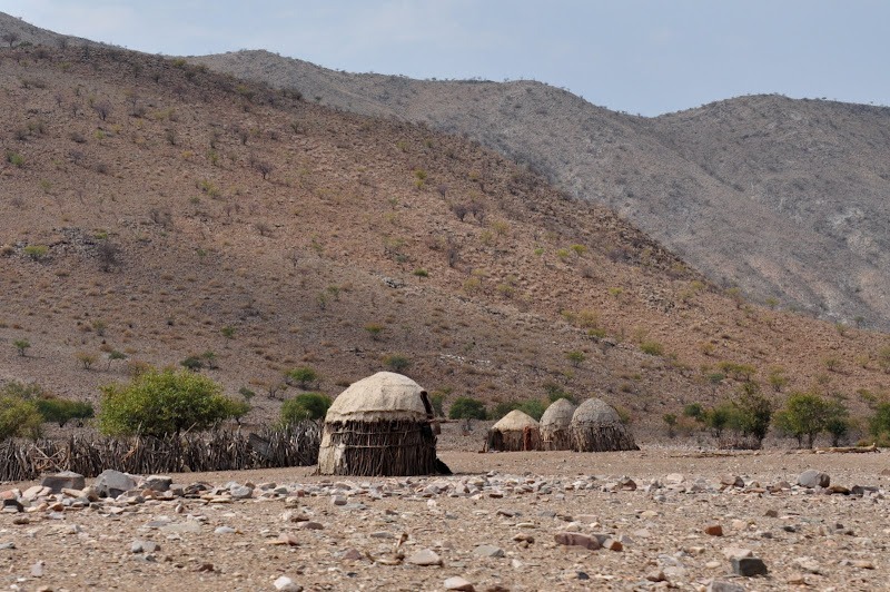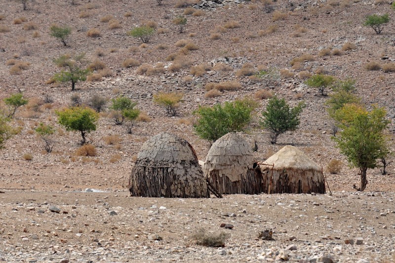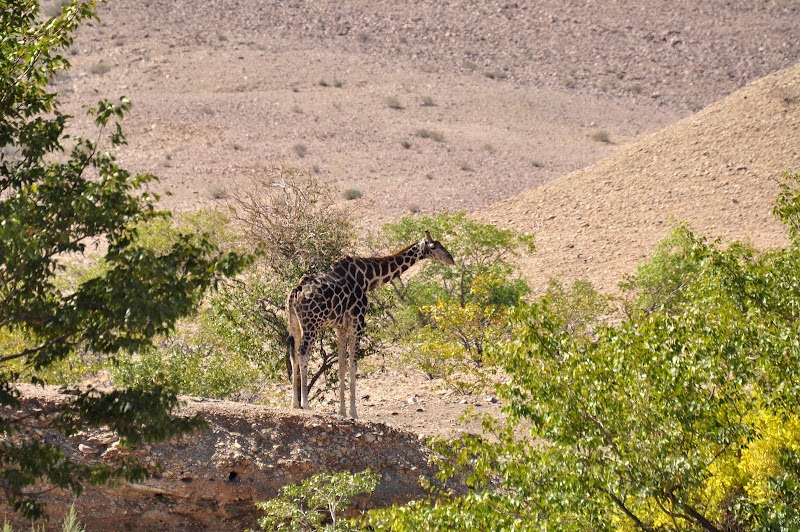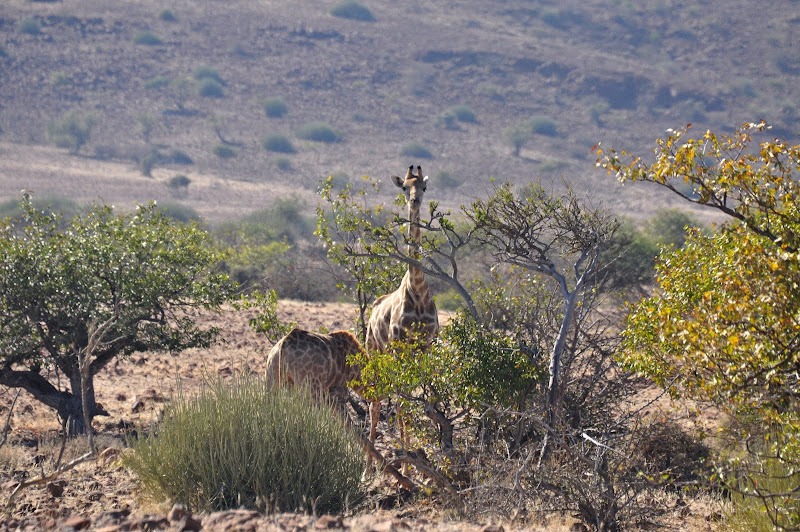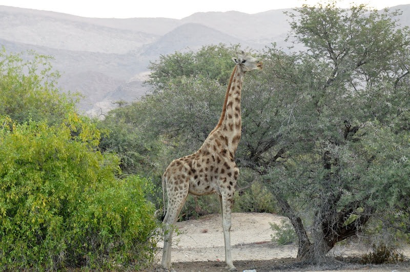 A partir de Sesfontein la piste devient plus petite et le paysage change. Nous sommes en pays Himbas dont les femmes sont recouvertes de terre rouge, c’est comment dire, très différent de la mode européenne. Paysages magnifiques mais peu d’animaux à part des chèvres, quelques vaches. Nous verrons tout de même nos premières girafes, un premier groupe sur la route et un deuxième en arrivant sur Purros.