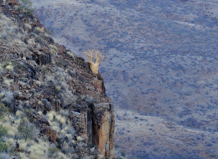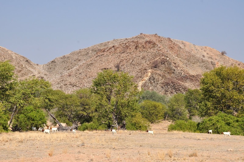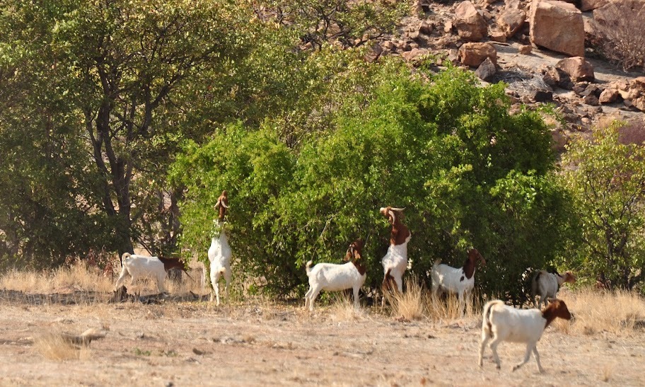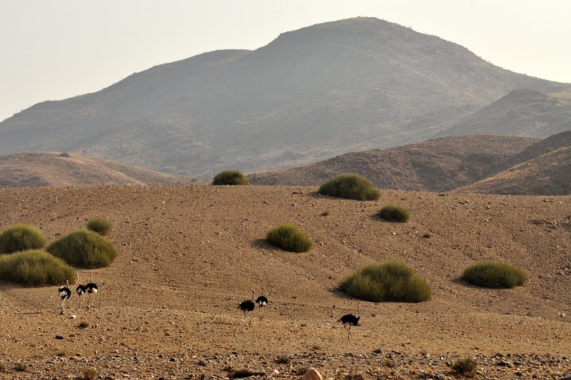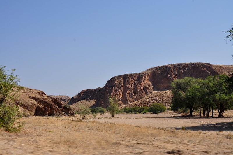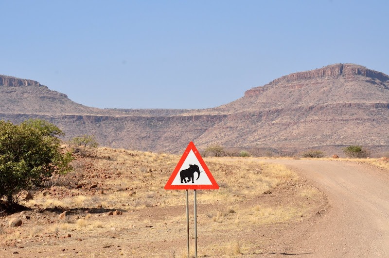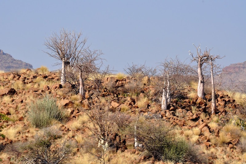 A partir de Sesfontein la piste devient plus petite et le paysage change. Nous sommes en pays Himbas dont les femmes sont recouvertes de terre rouge, c’est comment dire, très différent de la mode européenne. Paysages magnifiques mais peu d’animaux à part des chèvres, quelques vaches. Nous verrons tout de même nos premières girafes, un premier groupe sur la route et un deuxième en arrivant sur Purros.
