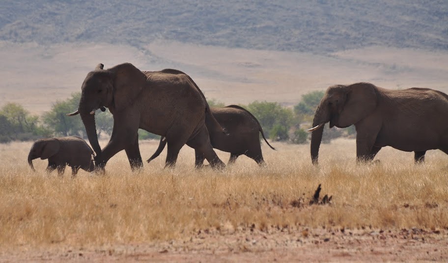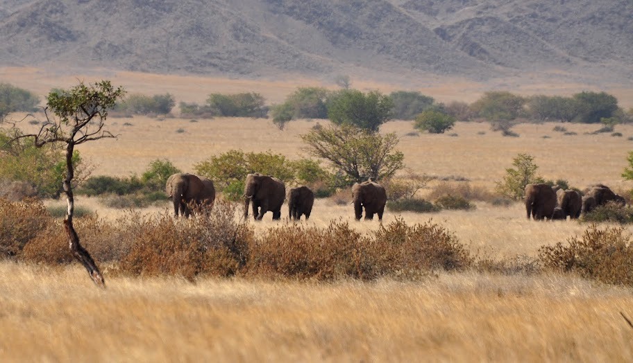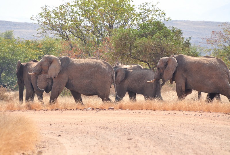 Nous bifurquons pour aller à Twyfelfontein et là on voit une voiture arrêtée et Léonie crie « ELEPHANTS ». A notre droite un groupe entier avec ados, petits, mamans et papas éléphants du désert, en tout une vingtaine d’individus.