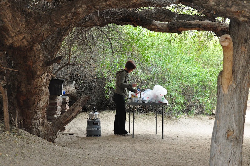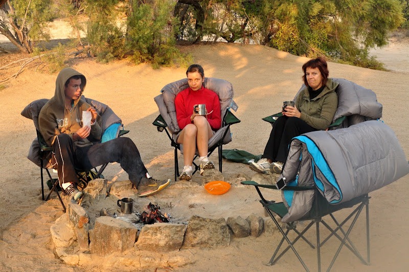 Lever dans la fraicheur, petit tour dans le camping désert pour voir la nature se réveiller, petit déjeuner autour d’une nouvelle flambée (spécialité de Théo). Tout va bien ! Quel bel endroit, on serait bien resté un jour de plus. Très vite le soleil nous réchauffera. Les amplitudes sont réellement très importantes de 6 nous passerons à près de 30° en pleine journée. Nos amis auront logé dans un lodge à proximité, sommaire mais bien.