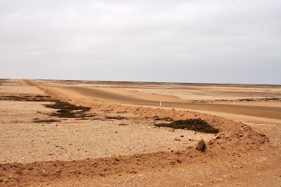 Nous retraversons Swakopmund, puis roulerons sur une route de sel durci au milieu du désert avec plus loin la mer. Comme c’est une région où il ne pleut jamais mais il y a beaucoup d’humidité amené par la brume matinale, sur le désert se sont développés des lichens de différentes couleurs.