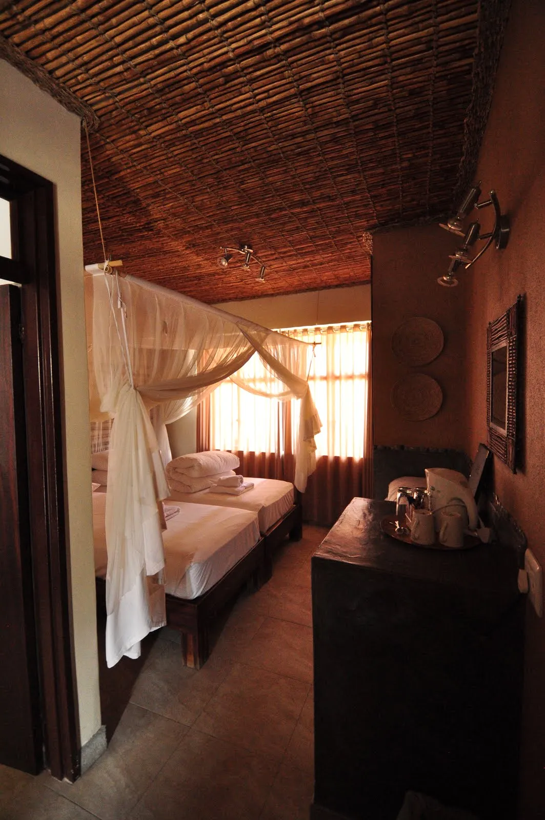 Le Lodge tout neuf (2011) est vraiment splendide dans un cadre majestueux. Nous serons répartis dans 4 chalets de 2 personnes. La structure du chalet est en bois et les parois en toile de tente avec des fermetures éclair un peu partout. Ici on n’a pas le droit de se déplacer seul dès qu’il fait nuit noir. On doit appeler la réception et une personne vient nous chercher pour nous accompagner au restaurant.
