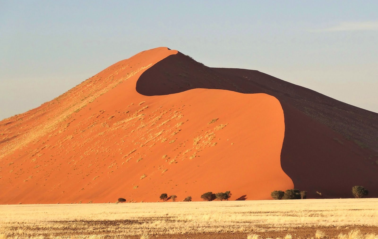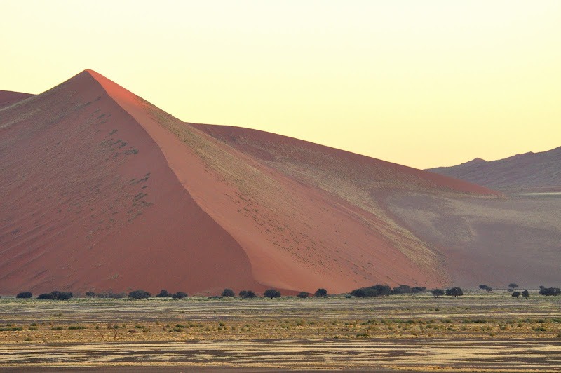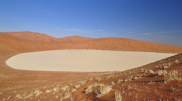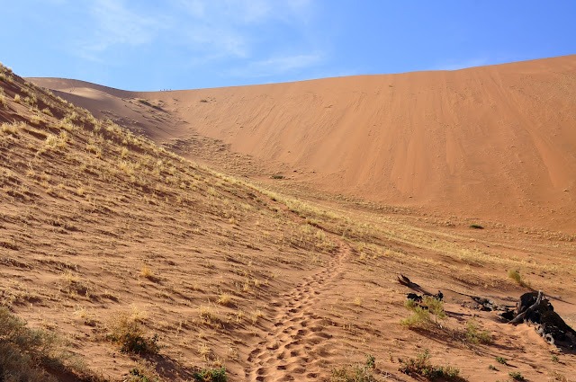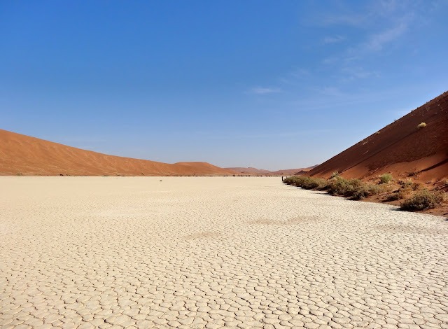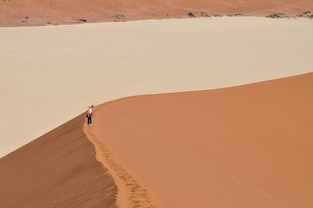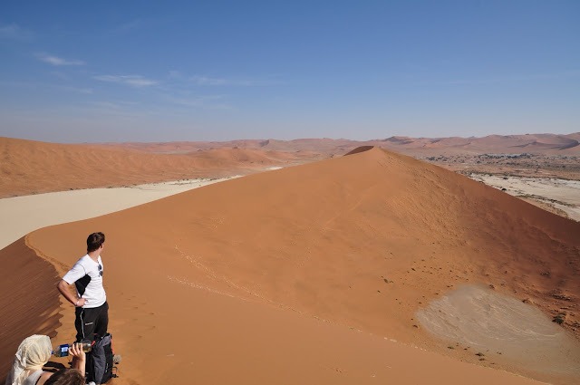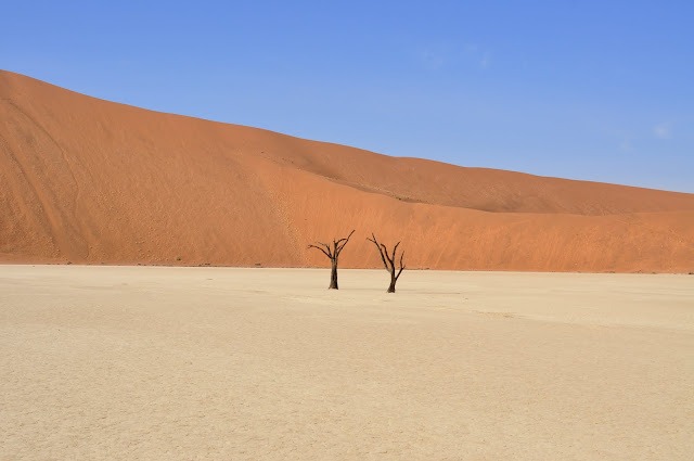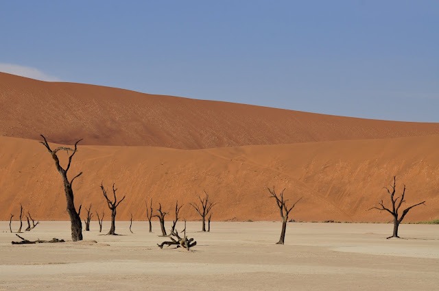 Ensuite nous allons découvrir un site magnifique, dont on trouve les photos partout : Deadvlei. C’est comme un lac salé entouré de dunes rouge où il ne reste que quelques acacias morts il y a 400 ans. En fait autrefois il y avait de l’eau mais maintenant à part de l’eau de pluie le lac n’est plus irrigué.