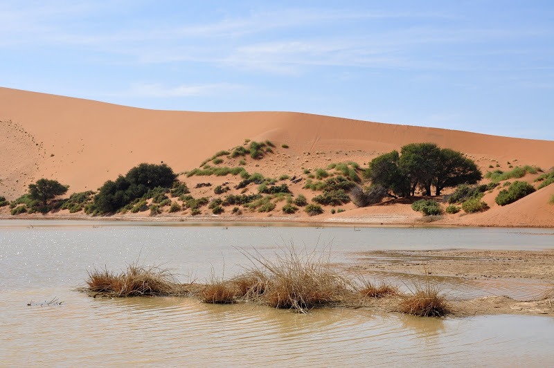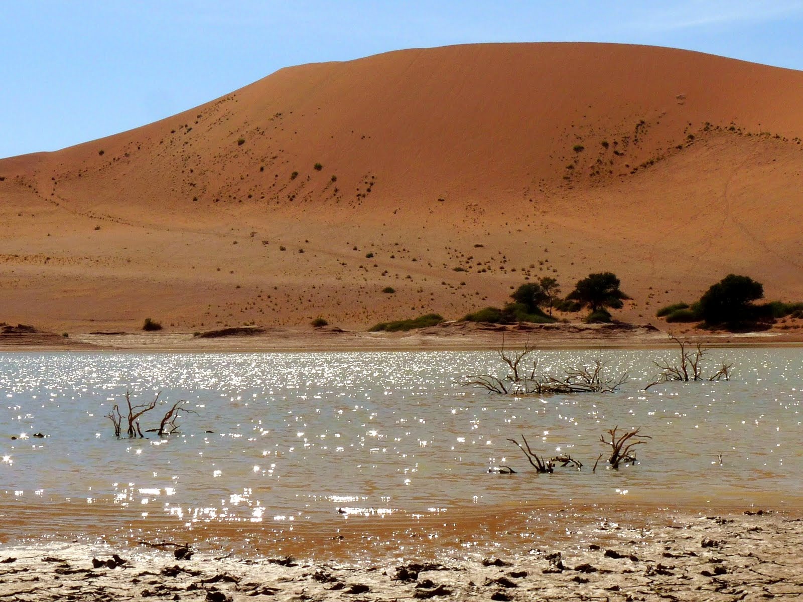 Pour revenir à nos dunes : après ce tour bien physique nous nous enfonçons encore plus loin dans les dunes avec les 4x4 jusqu’au site de Sossusvlei proprement dit. Là, étonnement, il y a encore de l’eau dans le petit lac, ce contraste eau / dunes désertiques est saisissant. Pas d’escalade cette fois juste un petit tour au bord de l’eau.