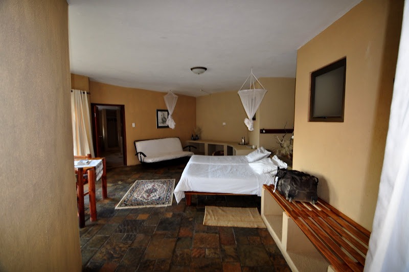 Tout est tôt, même le diner généralement servi à 18h30. Il sera bon, agrémenté d’un petit spectacle fait par le personnel du lodge. Nous aurons droit au menu décrit en langage des clics. En fait ils ne parlent pas qu’en clic, c’est comme si on remplaçait par exemple les voyelles par des clics et que le reste est normal. On croirait presque que c’est une autre personne qui place des clics de temps en temps en « surimpression » sur le discours « normal ». Les chambres sont belles et la literie aussi, nous passerons une bonne nuit … fraîche. Le fait qu’il n’y a qu’une heure de décalage horaire fait qu’il n’y a pas de temps d’adaptation, mais du coup on a moins l’impression d’être très très loin.
