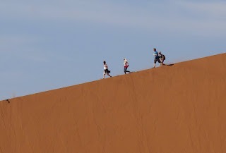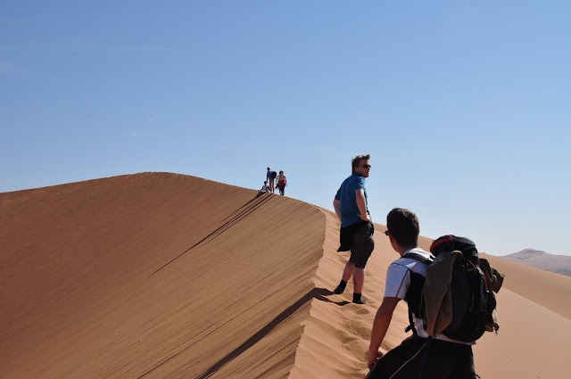 Comme nos amis logent à l’extérieur du parc (et pas en tente) ils ont laissé leur véhicule à l’extérieur et nous sommes allé à 7 dans notre 4x4 pour aller explorer la première dune, qui se nomme dune Elim. Piste, parking et escalade pour pouvoir la gravir et contempler le coucher de soleil. J’ai été surpris car elle est couverte de touffes de grandes herbes (faisant jusqu’à 1,5 mètres de haut). On fatigue rapidement à marcher dans le sable mou et chaque fois qu’on croit arriver en haut il y en a une plus haute derrière. Comme nous sommes un peu tard il n’y a que Théo qui ira jusqu’en haut. Nous nous attendrons le coucher de soleil un peu plus bas. C’est très beau, immense et des couleurs magnifiques ; l’herbe blonde, quelques arbres verts, les dunes orange et le ciel bleu. C’est parfait.