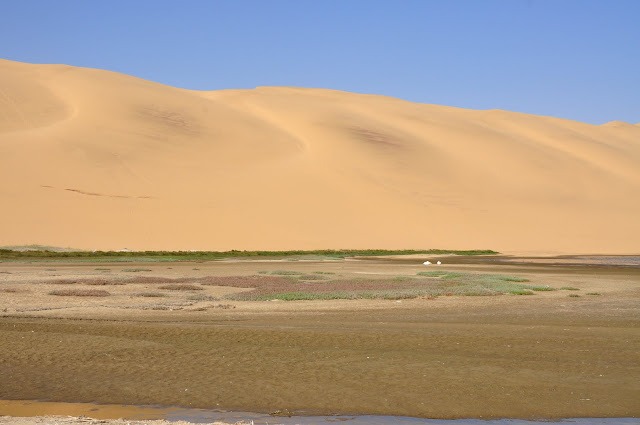 Pour la fin nous traverserons le delta du Kuiseb composé de petites dunes avec de la végétation, l’eau douce étant environ 50 cm sous le sable. Dernier coup d’œil aux parcs de désalination et aux montagnes de sel ainsi récupéré.
