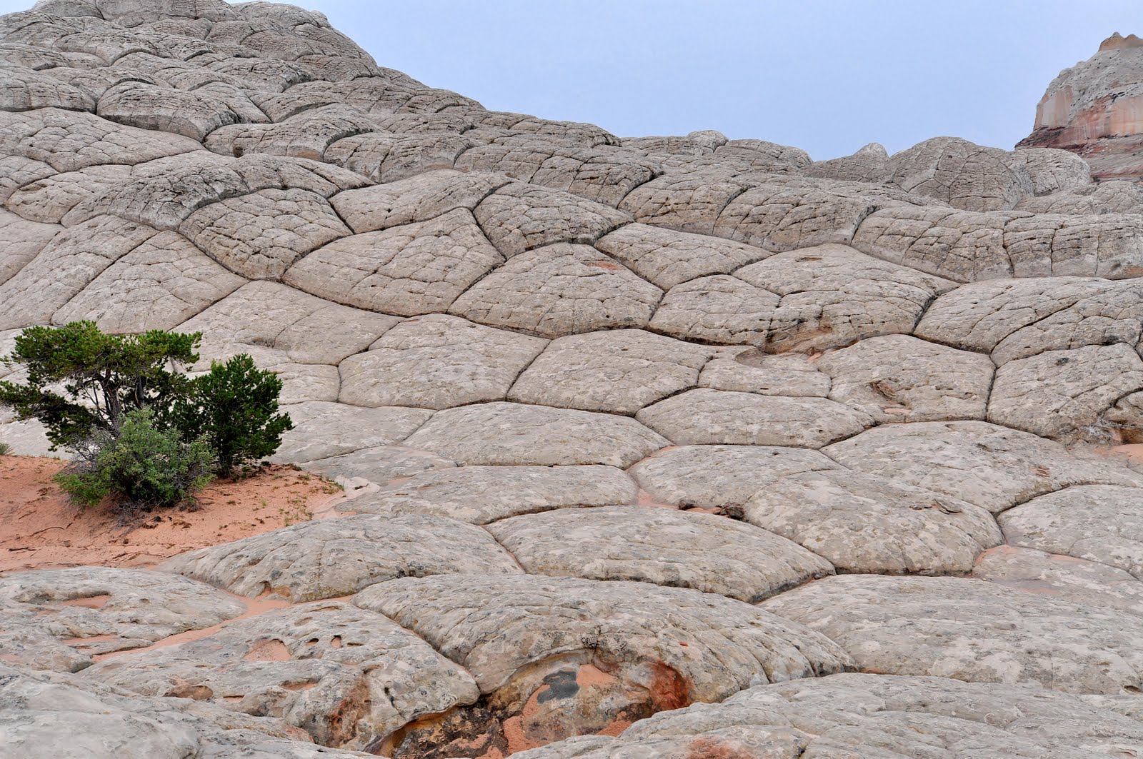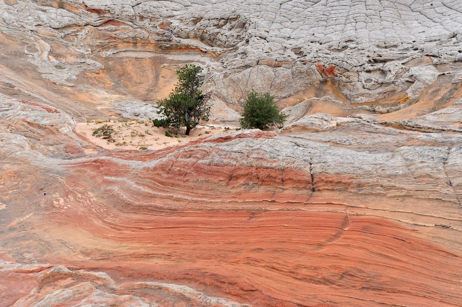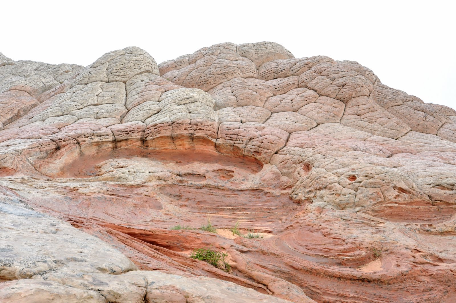 Maintenant direction White Pocket, piste encore plus floue, encore plus de sable, mais vaillamment notre guide mènera notre équipage à destination. White Pocket est très différent, le site est plus petit, de la roche avec une couche extérieure blanche dans laquelle on aurait découpé pour faire apparaître la chair d’un rouge très prononcé. Ici aussi pas de grande marche, juste une ballade photographique au milieu de ce paysage étrange.