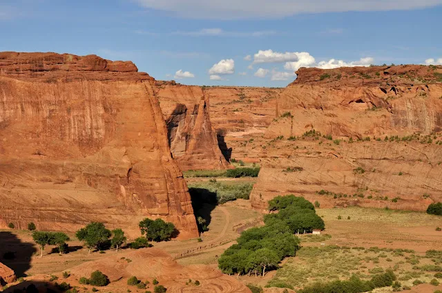 Ensuite nous reprenons la voiture direction le Canyon De Chelly, en faisant une halte à Désert Paint, paysages désertiques fait de dunes pétrifiées orange / rouge. Nous déjeunerons (pain, jambon, fromage, tomate, yaourt et fruit) à Chindle Point, où une belle aire de piquenique à été aménagée. Ensuite à nouveau 150 kms et nous arriverons à Chinle, ville « laide » s’il en est, on dirait plus un bidonville qu’autre chose.