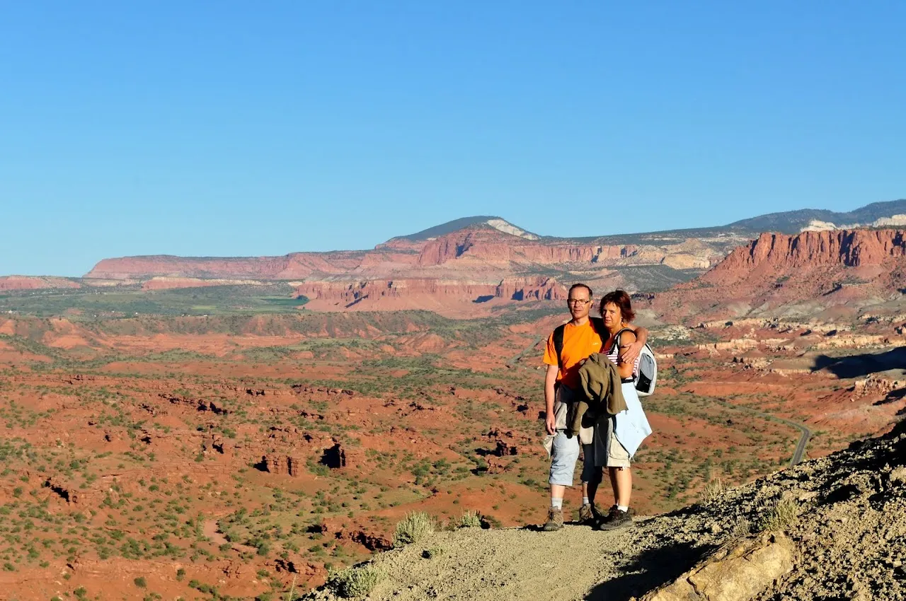 Pour les paysages la Hartner est effectivement plus belle que la Caineville Road, les paysages sont plus variés, le passage dans la Betonite, superbe, et les points de vue à la hauteur de mes attentes : grandioses. Nous déjeunerons au Upper Cathedral Valley Overlook. Ces cathédrales de pierre sont vraiment impressionnantes. Ensuite la descente, Gypsum, et « Temple of the Sun » et son copain « of the Moon », 2 monolithes immenses au milieu de la plaine. Nous ressortirons, ravis, côté Caineville à 15h.