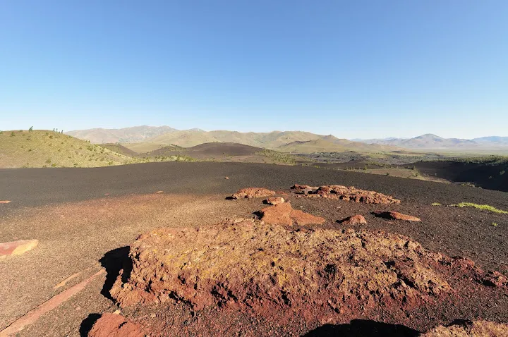 Check out et en route pour Crater of the Moon. J’étais mauvaise langue, finalement Arco est plus grande que je ne le croyais. En plus on trouve la ville, ses habitants et ses paysages remplis de « rien » très sympathiques. Une grande ligne droite de 20 miles et déjà nous sommes à Crater of the Moon. Nous arrivons à l’ouverture et sommes accueillis par un Ranger très avenant.