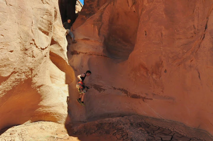 Du parking une descente vers les canyons. Nous commencerons par Dry Fork, pas de problème sympa. Suivra Peekaboo, ok on savait qu’il faudrait grimper, la corde est là pour cela. On s’y met de bon cœur, premier niveau, ok, deuxième, ok, troisième, aïe !, là il y a vraiment beaucoup de boue, Théo arrive à passer, Valérie et moi non, une fois qu’on a de la boue sur les chaussures s’est trop glissant, en plus il nous dit que plus loin c’est pas mieux, voir pire. Et nous avons déjà les chaussures pleines de boue. Demi-tour, légèrement dépité, mais on a vue les arches dans le canyon même si on aurait aimé aller plus loin.