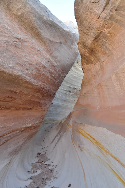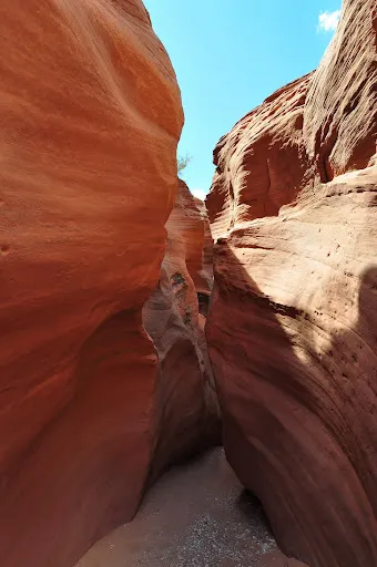 On prend la direction du troisième canyon, Spooky. L’attrait de ce canyon est son étroitesse et sa « forme en zigzag ». Alors ça pour être étroit il est étroit !, mon sac, même à la main, a du mal à passer. Faut pas être claustrophobe !. On progresse ainsi jusqu’au moment où le passage devient difficile. A ce stade Valérie fera demi-tour, Théo et moi nous continuerons jusqu’au bout, l’idée était de sortir à l’autre bout pour pouvoir rejoindre le canyon précédent (Peekabooy pour ceux qui n’avaient pas suivi) et pouvoir le redescendre. Je m’étais mis cette idée dans la tête dès que j’ai vu que nous n’arriverions pas à progresser dans Peekaboo.