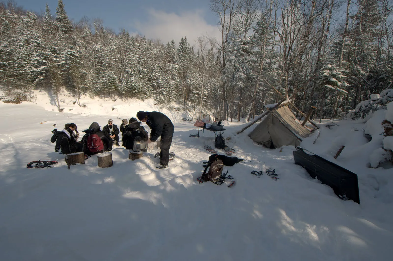 Aujourd'hui c'est raquettes. Ballade sympa dans la forêt et déjeuner trappeur autour d'un feu.