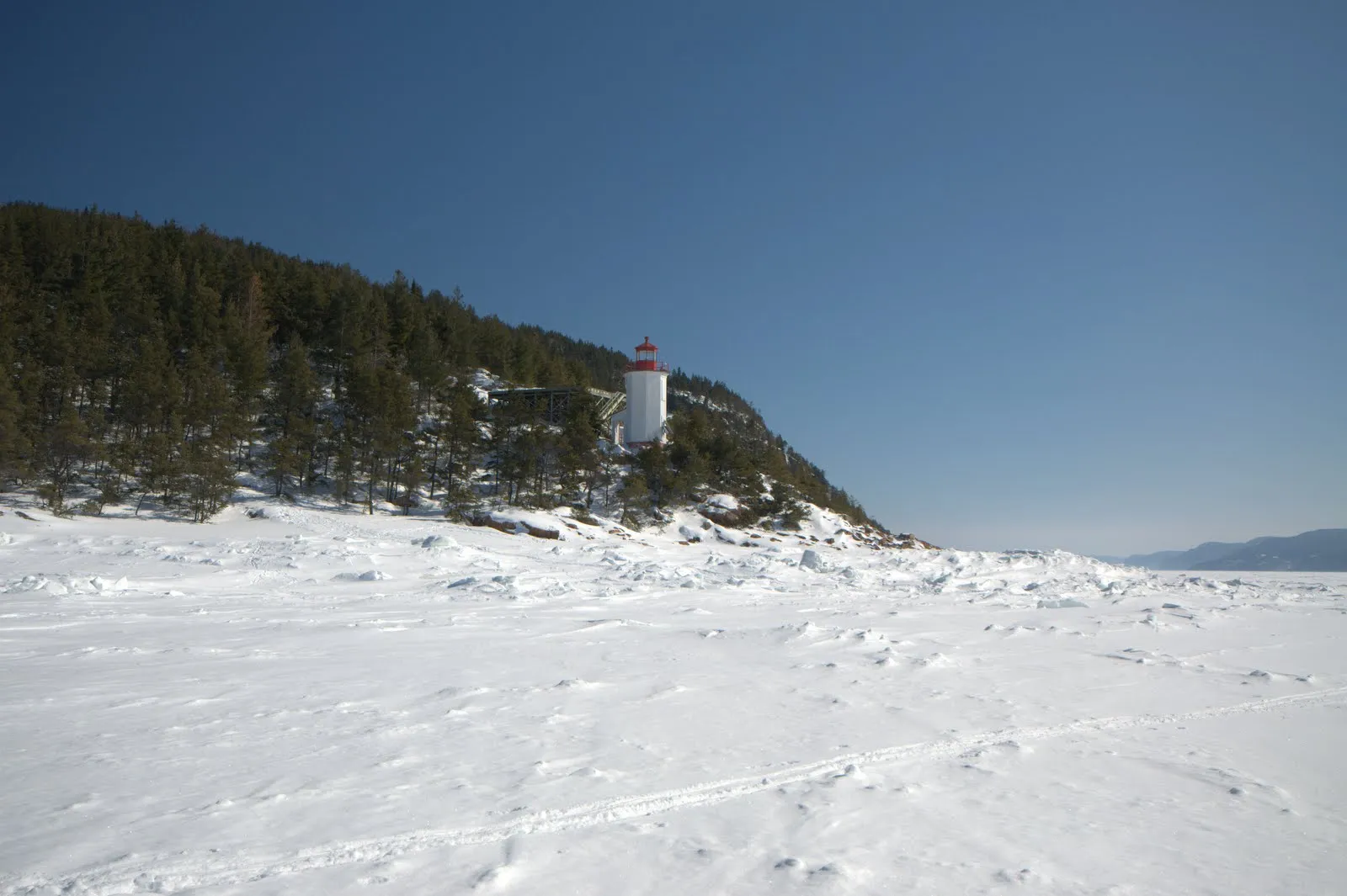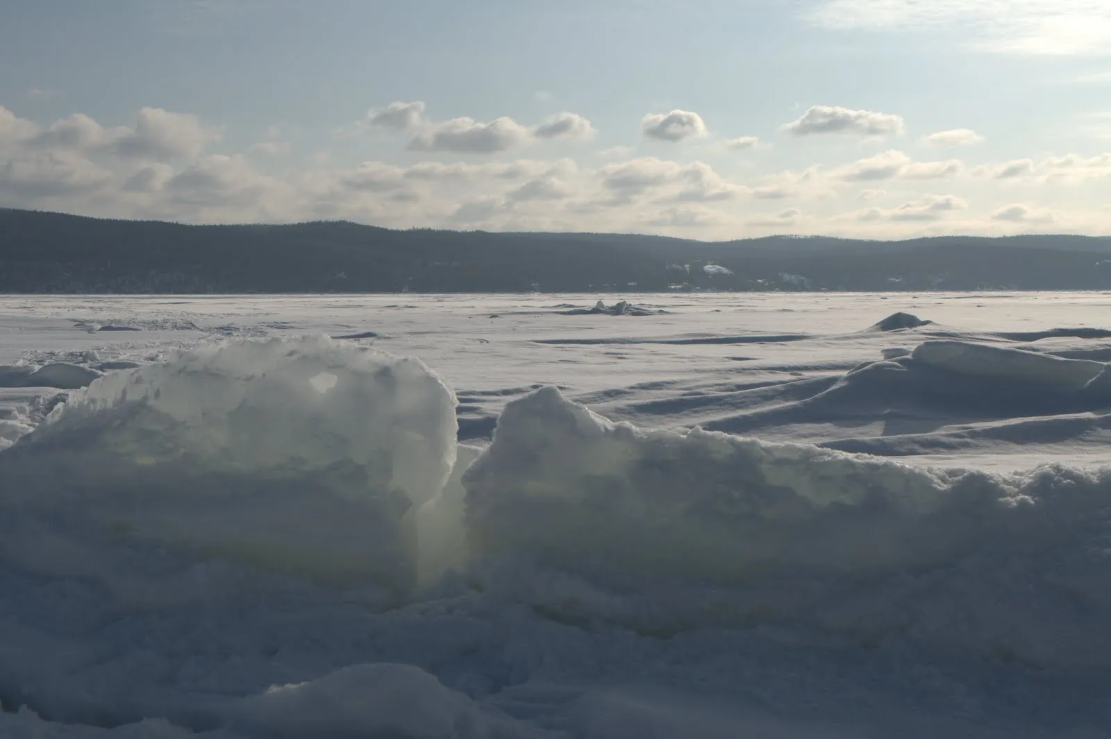 Dommage que le ciel soit couvert, en plus les vitres sont sales, je peux ranger l'appareil photo. Nous arrivons à Chicoutimi (joli nom). Traversons le Saguenay et longeons la rive nord jusqu'à notre “pourvoirie” après une dernière piste entièrement dans la neige au milieu de nulle part.