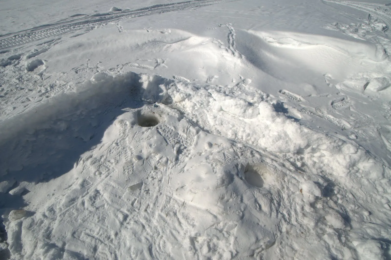 L’après-midi nous descendrons sur le fjord sous un magnifique ciel bleu. C'est magique de marcher sur cette étendue de glace. Vous pouvez vous tranquilliser, elle fait 60 cm d’épaisseur. Au milieu il y a un chenal maintenu ouvert par un brise glace. Au bord du fjord la glace est toute "explosée", en fait c'est dû à la marée (la mer est à 80 km), lorsque le niveau monte et baisse la glace se brise.