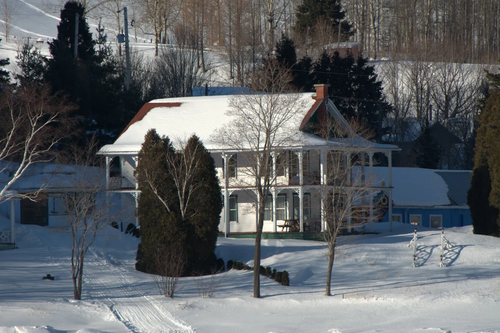 Ensuite à nouveau 2h30 de route à travers les Laurentines, région très vallonnée et couverte de forêts. Ah!, j'ai oublié de parler de l'essentiel: la neige. Il y en a !, tout est blanc, il neige même par moment.