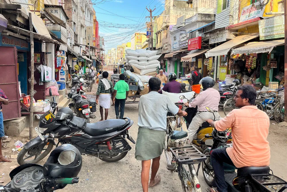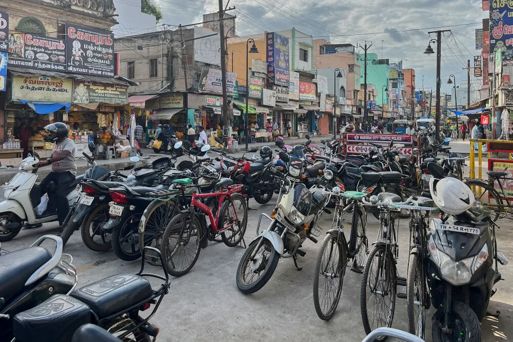 Au déjeuner, JF prendra un tali, on prendra des assiettes avec assortiment de nourriture peu épicée. Arrivée à l’hôtel à Madurai vers 14h, on attendra que les chambres soient disponibles jusqu’à 15h. Puis visite de la ville à pied, on ne se croirait pas dans une ville de plusieurs millions d’habitants.