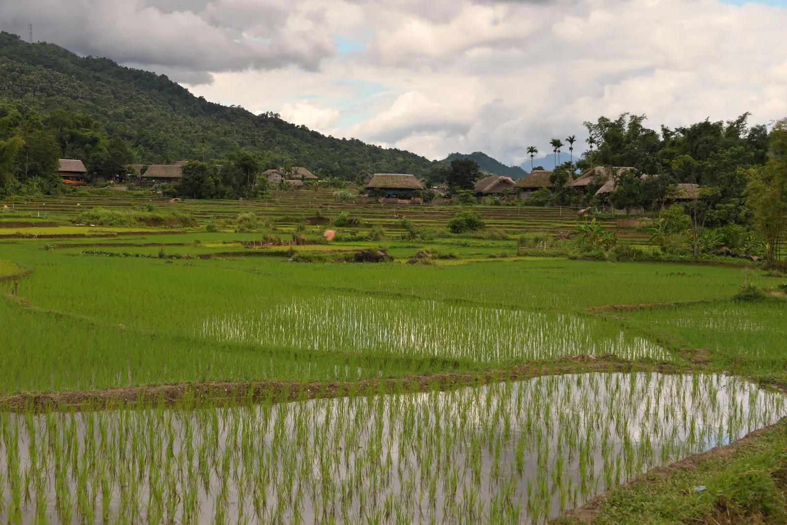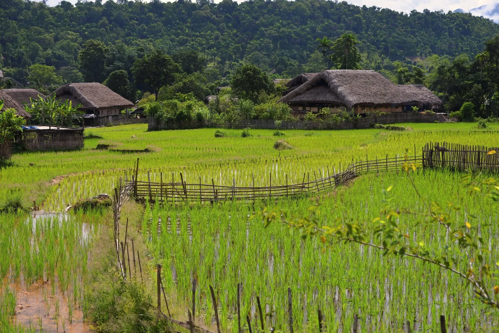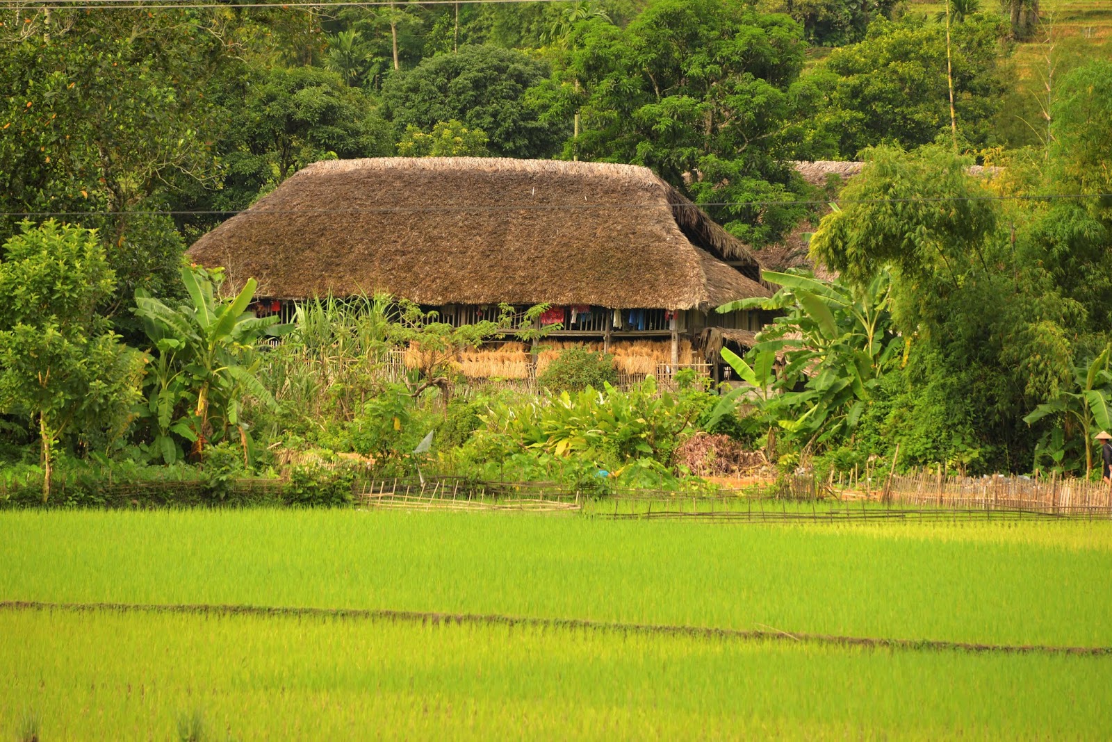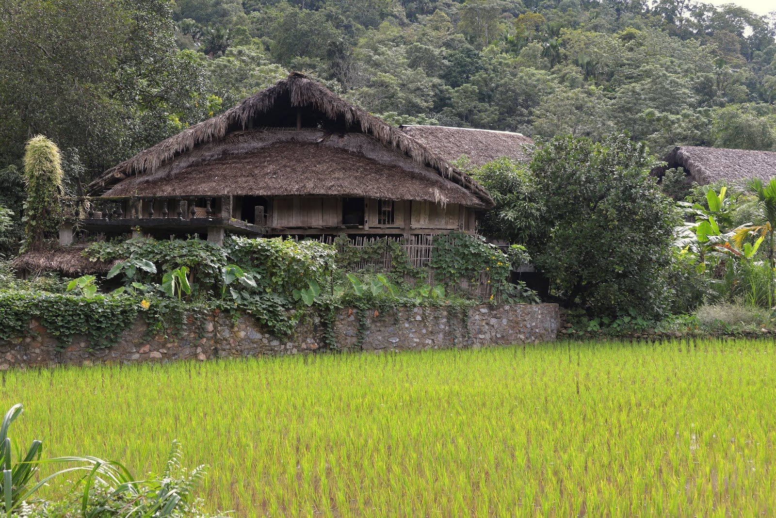 Leurs villages sont très beau, maisons en bois sur pilotis, toit en chaume et au milieu des rizières. On a bien pu se promener. L’allée principale est bétonné, comme souvent au Vietnam, en fait l’Etat fournit gratuitement du béton, charge à chaque village d’en faire ce qu’il veut. Nous y verrons la salle communale, puis nous montons jusqu'à la forêt, nous arrêtons dans une maison où Théo a joué au cartes avec une jeune fille pendant que la maman nous expliquait leur mode de vie. Ensuite retour vers la route principale où nous verrons une famille fabriqué le tofu.