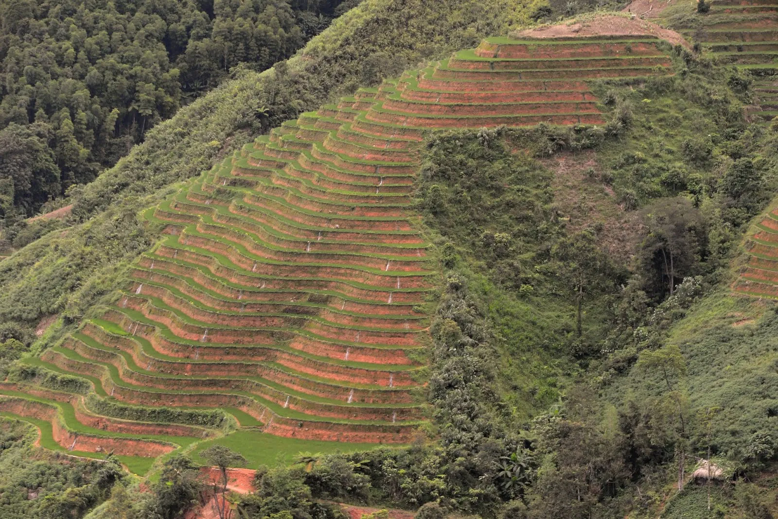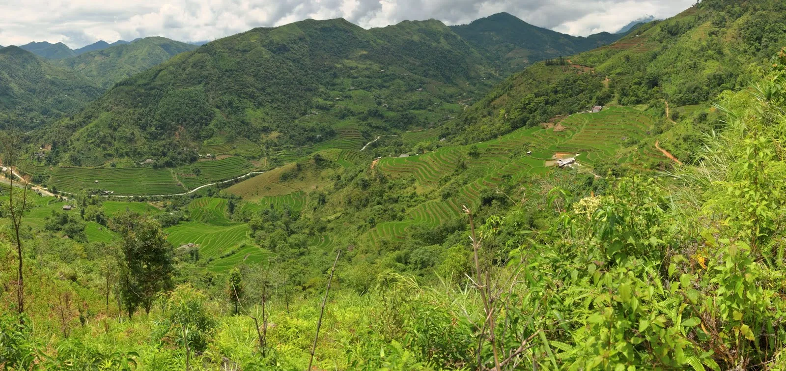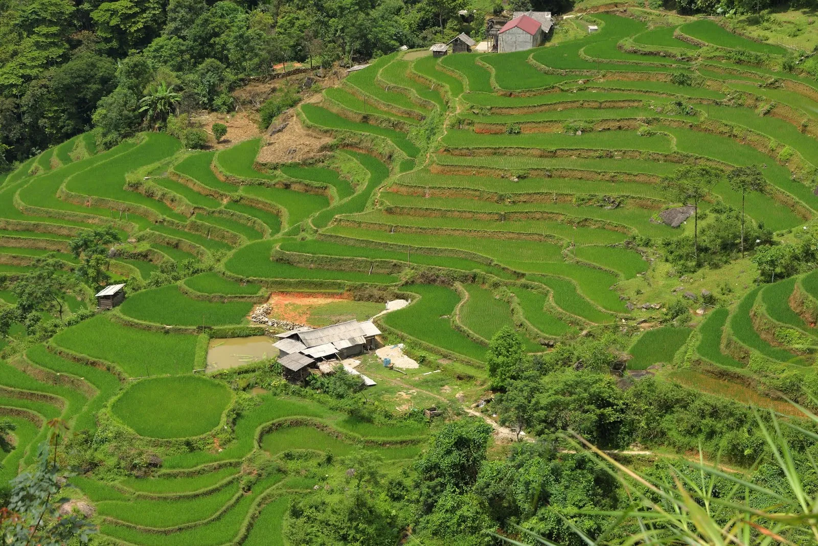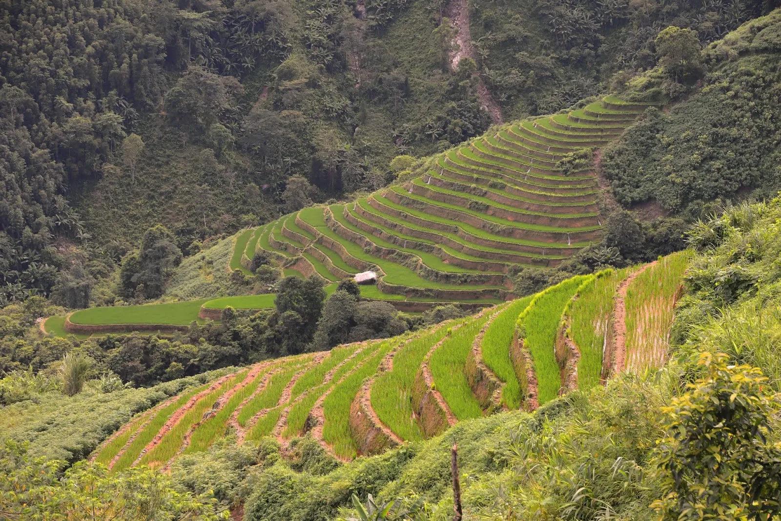 A Tan Quang, nous avons tourné à droite direction Hoang Su Phi. La route est « montagneuse », en lacets, à flan de montagne avec de magnifiques vues sur la forêt et les rizières en terrasse. Après le col nous avons tourné à droite, si si je vous promets ! vers Nguyen.