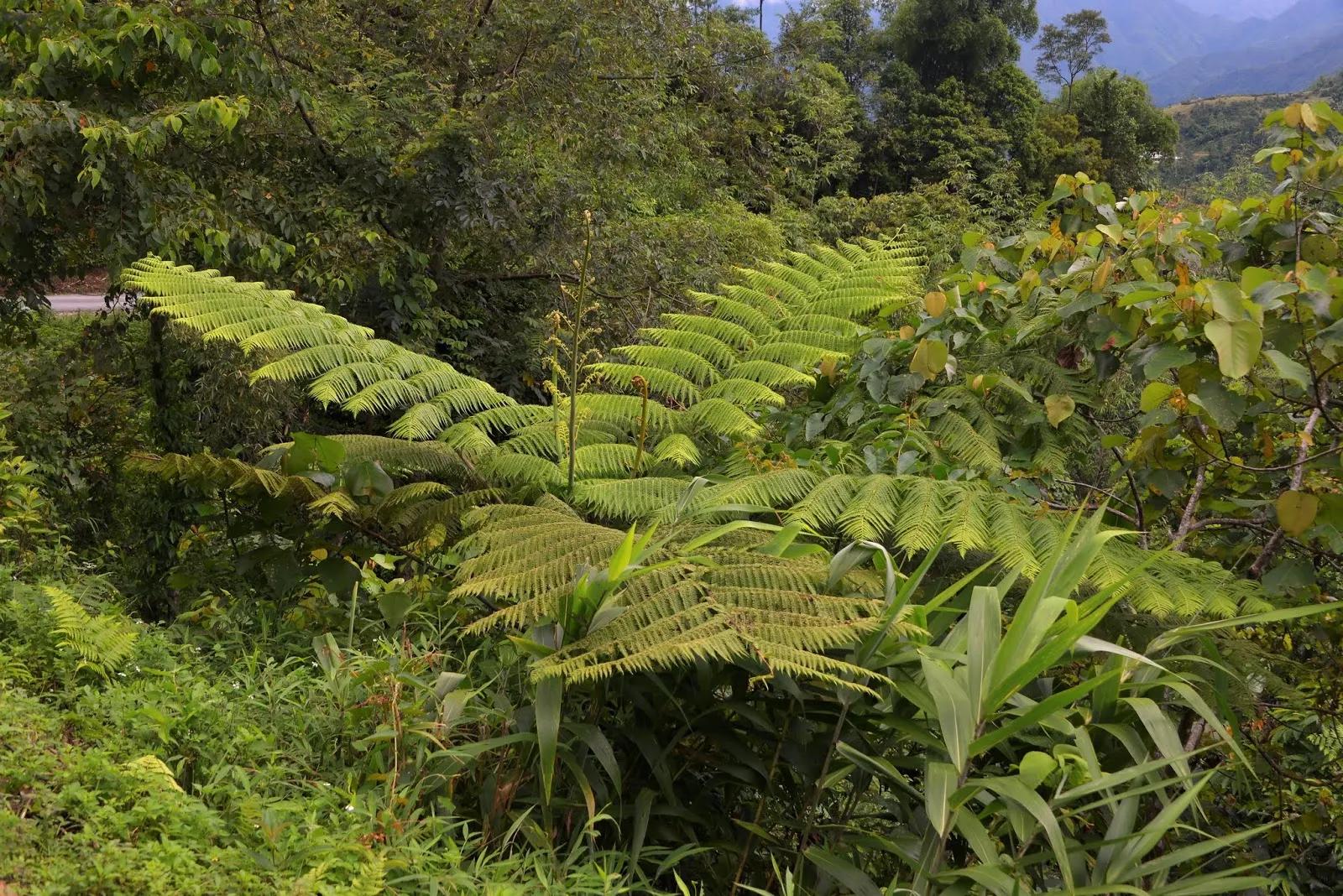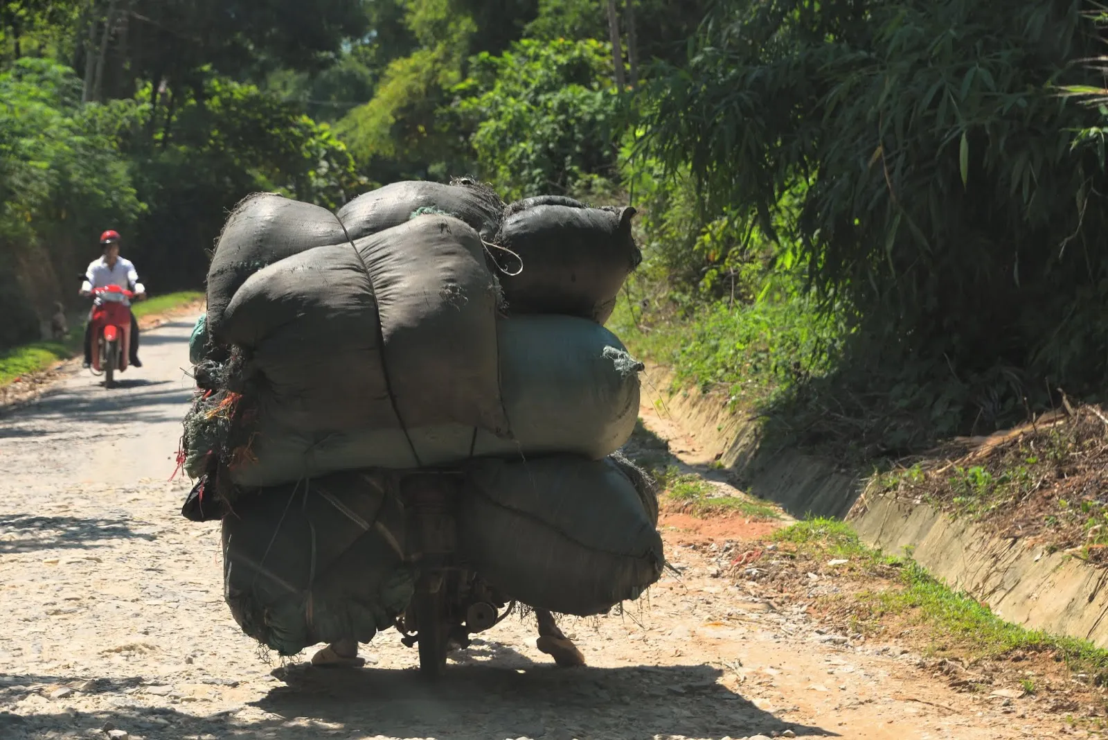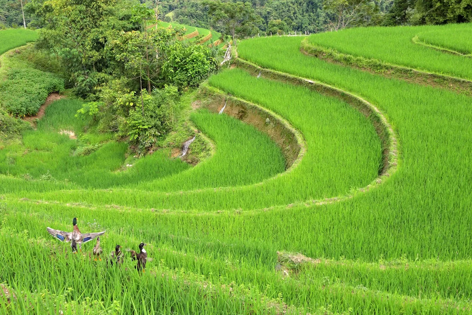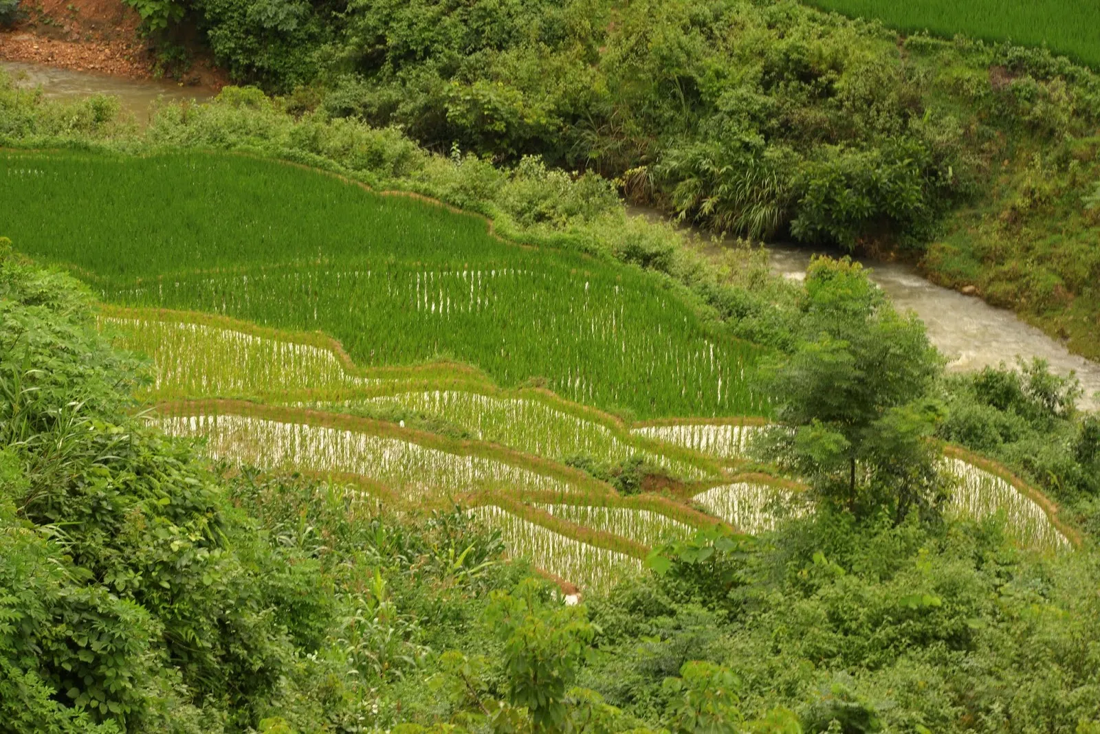 A Tan Quang, nous avons tourné à droite direction Hoang Su Phi. La route est « montagneuse », en lacets, à flan de montagne avec de magnifiques vues sur la forêt et les rizières en terrasse. Après le col nous avons tourné à droite, si si je vous promets ! vers Nguyen.