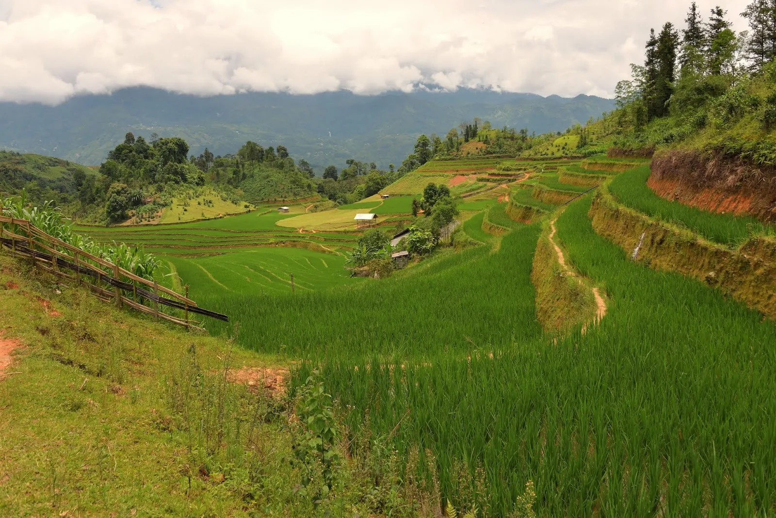 La randonnée fait une dizaine de kilomètres et elle est vraiment très belle, forêts de bambous, rizières en terrasse, cascades, buffles et bien sûr quelques habitations. Au niveau dénivelé, on monte et on descend, je dirais au total 300 ou 400 mètres de dénivelé. Nous nous arrêterons chez une famille Dao longues tuniques, puis Dao rouges où nous déjeunerons. Le déjeuner est « tiré du sac » du lodge. Là ils n’auront pas une médaille : riz mélangé et une salade tomates thon, on se serait cru en colonie de vacances. Sinon le reste sera très bien et on sera particulièrement heureux de se promener au milieu de paysages magnifiques. C’est vraiment très bien de combiner la marche et les rencontres.
