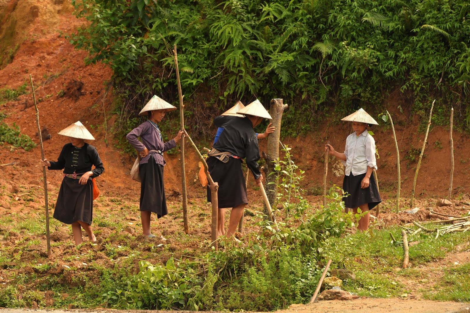 Un peu de voiture, puis un second village Tay. Dès l’entrée je repère une « menuiserie », quelques photos pour pouvoir comparer le matériel et en avant pour une plus longue ballade au milieu des rizières. Nous finirons dans une maison où nous sera servi un très bon repas (nems, riz, poulet sauté aux oignons, porc au caramel, pousses de citrouilles, fanes de « verdure », citrouille frite, banane, pastèque).