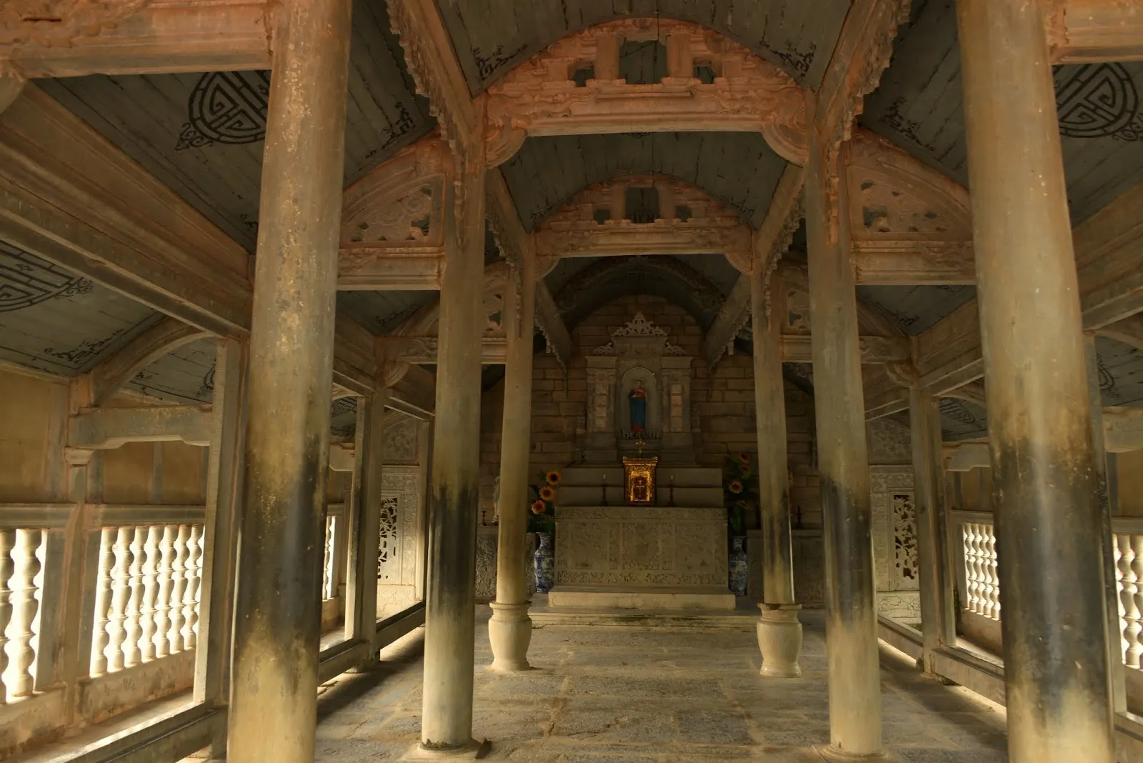 Après un petit déjeuner dans notre hôtel stalinien, somme tout correct, nous entamons notre journée du plan B. Il faut savoir que dans la région de Ninh Binh les habitants sont majoritairement catholiques. Ils représentent 13% de la population globale, certes loin derrière les bouddhistes. C’est surprenant de croiser toutes ces églises. Ce matin nous irons visiter l’ensemble épiscopal de Phat Diem. C’est très intéressant et étonnant. La visite se fera « entre les trombes d’eau ».